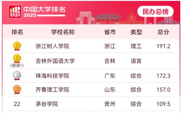 “2025软科中国大学排名”的对象是中国1000多所本科层次的高校;其中,民办高校排名(主榜)的上榜高校共169所。茅台学院作为全国民办高校第22名,贵州民办高校第1名,充分彰显了学校的办学实力和水平。