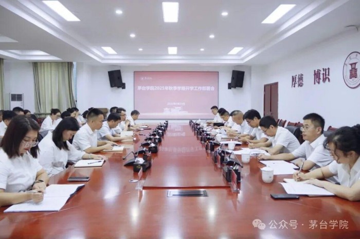 8月29日,茅台学院在行政楼二楼会议室召开2025年秋季学期开学工作部署会。党委副书记、副董事长李贤富出席并主持会议,副校长张春林,总会计师邹洪芳,副校长程庆、田戊戌,纪委书记周长辉,副校长闫松显、张珊、赵正一出席会议。