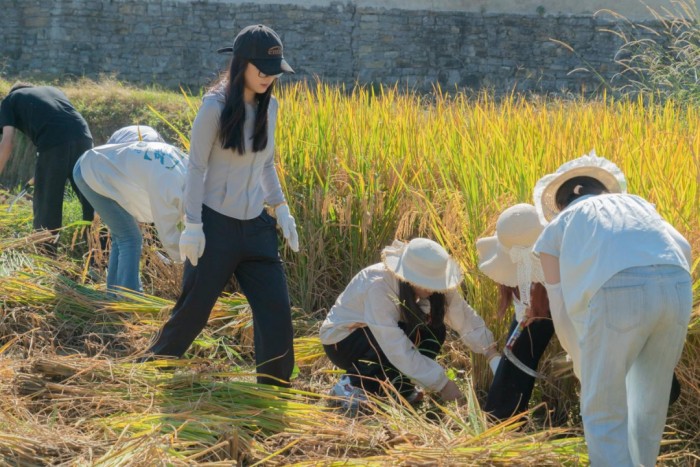 抵达路寨村后,在郭薇书记及村民的现场指导下,师生党员快速掌握割谷、打谷、装袋等农耕技巧,纷纷拿起镰刀、扛起粮袋,投身田间劳作。张福高书记与两位教师带头参与,在收割谷子的同时,与郭薇书记深入交流村情民意,重点探讨粮食产销、乡村治理中的实际问题,尤其围绕“三农”领域法律实务展开细致沟通。师生党员分工协作、相互配合,即便汗水浸透衣衫仍干劲十足,以实际行动践行“为人民服务”的初心使命。