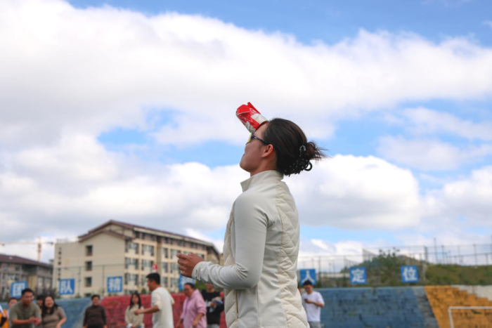 “夹纸顶杯”项目考验着选手的平衡感与专注力,老师们头顶纸杯、手夹纸片,小心翼翼地稳步前行,即便偶尔出现纸杯掉落、纸片滑落的小插曲,也能笑着快速调整状态重新出发,展现出从容不迫的师者风范。