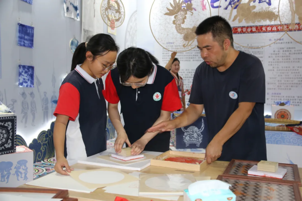活动嘉宾参观毕节市第二实验高中展区并体验制作苗绣产品
