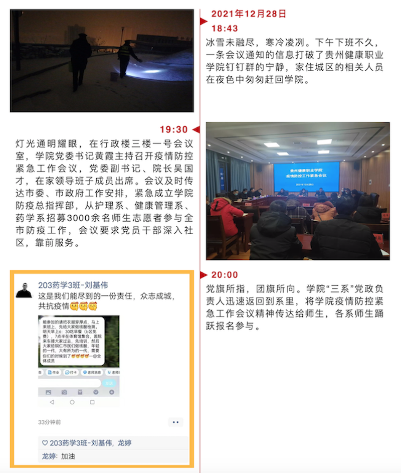 12月28日晚上7点,贵州健康职业学院接到铜仁市委、市政府任务,要求调配3000余名师生于12月29日清晨7点到全市600个志愿服务点参与防疫工作。