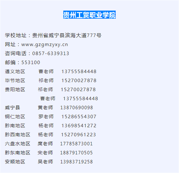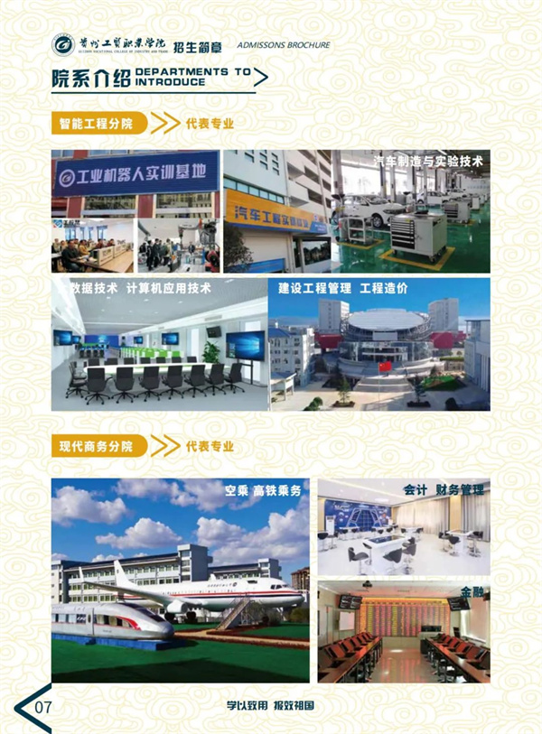 贵州工贸职业学院是经贵州省人民政府批准成立、国家金博宝最新官方网站查询网址 备案的全日制应用型现代化高等学府。学院秉承“学以致用,报效祖国”的校训,围绕“智能制造”、“现代商务”、“健康服务”、“高雅艺术”四大行业,设置了智能工程分院、现代商务分院、健康与体育分院、艺术分院、退役军人教育分院、马克思主义学院,共精准开设42个专业,建设了一支高素质“双师型”具有国际化视野的师资队伍。目前,在校生10068人。