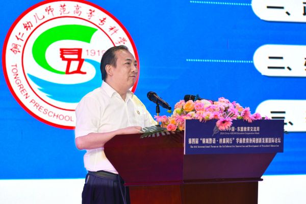 冉俊华在致辞中首先对各位嘉宾到来表示热烈欢迎,他指出,第四届“铜城黔语·丝露同行”学前教育协同创新发展国际论坛在铜仁幼儿师范高等专科学校召开,是铜仁市教育系统的一件大事、喜事,既充分展示铜仁教育高质量发展和国际化办学成果,又是推动学前教育对外开放合作交流的一次重要机遇。今天,各位中外学前教育领域知名专家学者齐聚一堂,共同交流学前教育发展前沿理论、前线经验,这必将推动铜仁市学前教育事业高质量发展,必将加快构建铜仁市教育对外开放新格局。