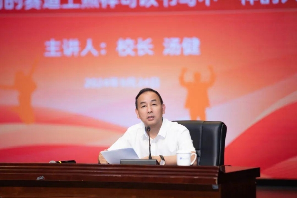 汤健紧扣“改革与改变,职业与梦想”两组关键词,以《时代因改革而进步青春因改变而精彩在不同的赛道上书写不一样的人生》为题,聚焦深化学校综合改革,围绕紧跟时代步伐,争做教育改革的“推动者”;汲取榜样力量,跑好砥砺奋进的“接力赛”;不负时代韶华,书写无悔青春的“答卷人”三个方面解读了学校贯彻落实党的二十届三中全会精神推动各项工作高质量发展的具体举措;从统筹推进育人方式改革、统筹推进办学模式改革、统筹推进管理体制改革、统筹推进保障机制改革四个方面与参会师生分享了学校人才培养模式改革的理念、做法和成效。
