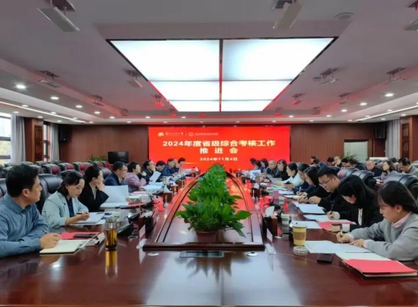 在云潭南路校区教学科研楼三楼会议室召开2024年度省级综合考核工作推进会,在家校领导、各部门主要负责人、二级学院(部)党政主要负责人参加,会议由校党委副书记、校长汤健主持,校党委书记令狐彩桃出席并讲话。