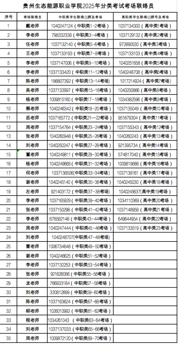 考生打印准考证时,请按照准考证上测试地点显示的考场号加入指定的考场联络QQ群。学院为每个考场QQ群安排了一位老师作为考场联络员(详见附件1)。考生申请入群时,需向群管理员提供身份验证信息。加入群后,请及时修改群名片(以自己姓名命名),并可在群文件中自行下载打印《贵州生态能源职业学院2025年分类考试准考证》及学习《考生诚信考试承诺书》。请考生认真核对自己所填报专业是否相符,如有误请及时与群管理员联系。