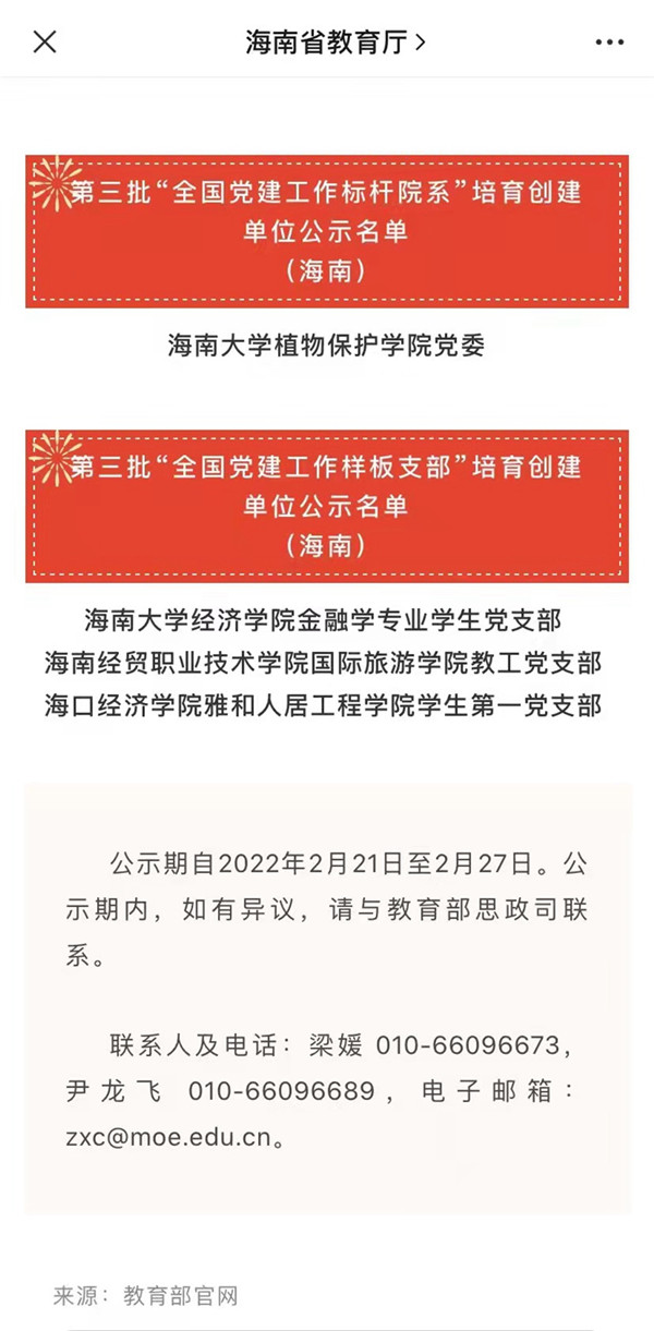 喜讯!海口经济学院一党支部入选“全国党建工作样板支部”培育创建单位公示名单