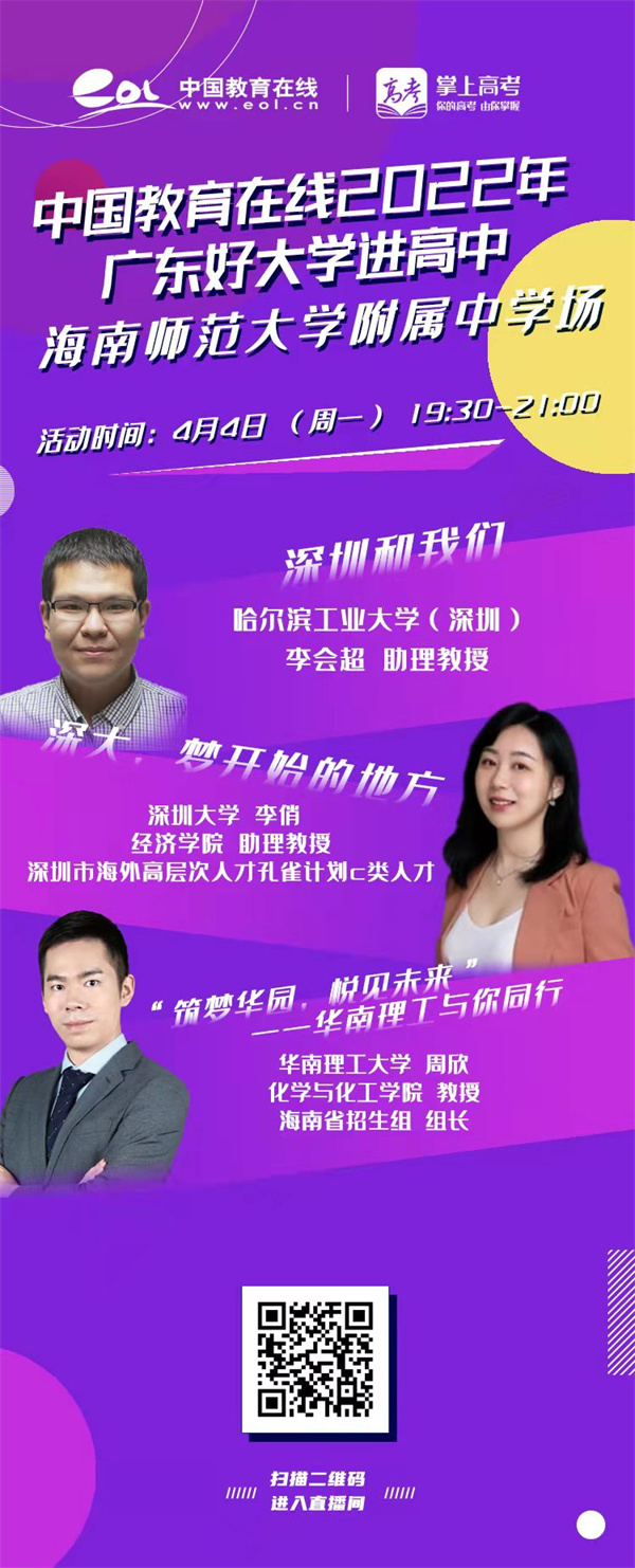 邀请了哈尔滨工业大学(深圳)、深圳大学、华南理工大学为海南师范大学附属中学高三学生家长在直播间在线讲解交流。直播间公益开放,也欢迎更多学子与家长来互动哦。点击链接可预约直播间