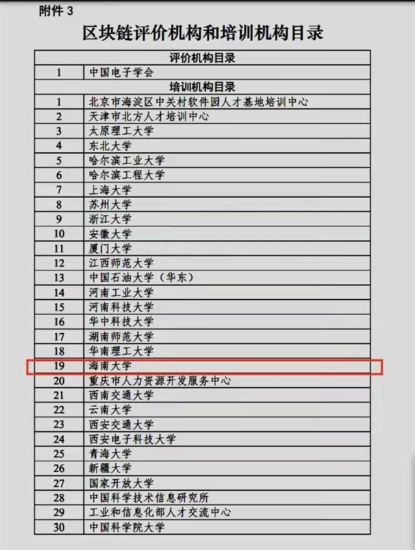 近日,人社部中国就业培训技术指导中心公示了数字技术工程师培育项目首批培训机构名单,海南大学顺利入围,成为海南省内首批数字技术工程师培育项目区块链方向唯一培训机构。该项目由海南大学继续教育学院、计算机科学与技术学院联合申报。