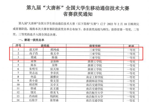 日前,2022年第九届“大唐杯”全国大学生移动通信技术大赛顺利完成省赛阶段,理工学院同学温文祥和邢鸿成、高子浩和张文卓、梁威和陈强三个团队同时荣获一等奖,此外,理工学院学生团队还获得二等奖3个,三等奖5个。