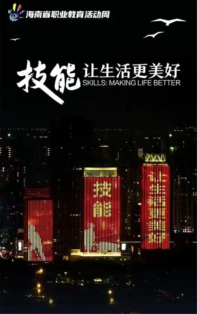 海口市地标建筑的LED灯滚动字幕为职业教育活动周亮灯