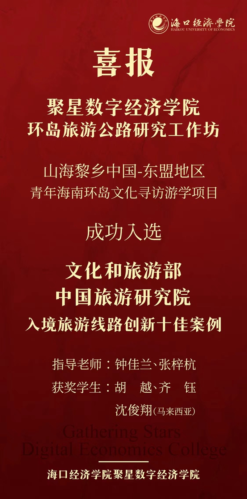 6月25日,由中国旅游研究院、海南省旅游和文化广电体育厅、三亚市人民政府联合主办的海南国际旅游目的地交流对话会在三亚举行。聚星学院环岛旅游公路研究工作坊申报的“山海黎乡 中国-东盟地区青年海南环岛文化寻访游学项目”成功入选2024中国入境旅游线路创新案例十佳,并作为海南国际旅游消费中心建设的入境项目向全球发布。