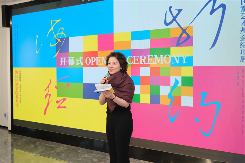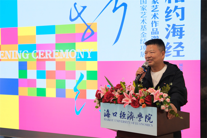 海口经济学院执行校长彭京宜在致辞中表示,此次活动以艺术为名,诚邀省内外几十位艺术名家汇聚海口经济学院,共同见证首场国家艺术基金项目成果展启幕,必将为学校美育事业发展注入蓬勃活力。他指出,美是纯洁道德、丰富精神的重要源泉,美育的职责就是要让人懂得如何感受美、欣赏美并创造美,我们要坚定自信,将美育融入落实立德树人根本任务全过程,向美而行、以美育人,扎根时代生活,遵循美育特点,弘扬中华美育精神,让青年一代从校园起步,构筑起多彩、丰盈、积极的精神世界。