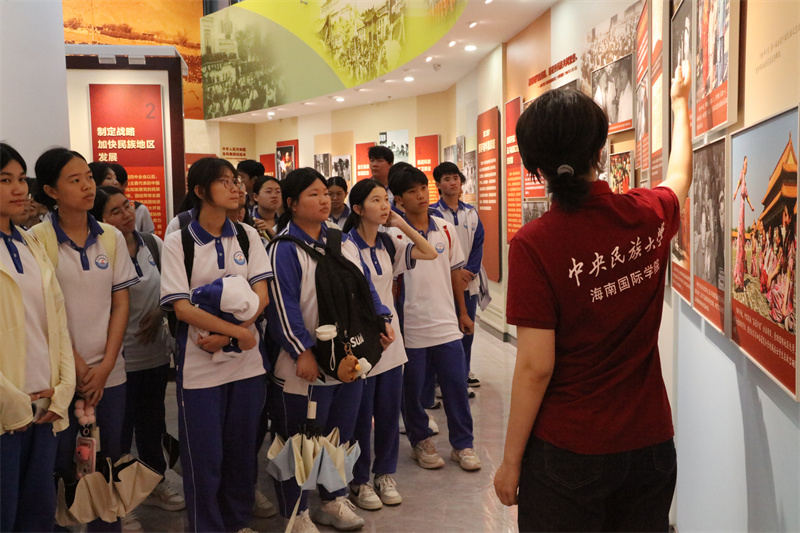 活动首站,同学们来到了中央民族大学海南国际学院实地观摩“中华一脉 同心筑梦”——中国共产党民族工作光辉历程和伟大成就主题展·中央民族大学海南国际学院巡展。在中央民族大学海南国际学院黄河滔老师和大学生志愿者们的带领和讲解下,参与观摩的同学们认真回顾党的民族工作光辉历程和伟大成就,在历史的传承和赓续中收获感悟,让铸牢中华民族共同体意识具象化。