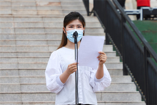 在国旗下,三亚学院传媒与文化产业学生代表沈秋月讲述了中国战“疫”故事,欣喜于大家从寒冬到暖春再到盛夏重逢校园,对连日来老师们为学生顺利返校的辛苦付出表示衷心感谢。“这次疫情让我们措不及防,面对这场没有硝烟的战争,大到国家小到个人,无一不奉献自己的力量。我们看到了勇敢逆行者的果敢,他们扶危渡厄、守土尽责,带给我们无限的勇气和力量。岁月是最好的见证者,现在的我们付出过怎样的努力,未来我们就会有怎样的底气。”