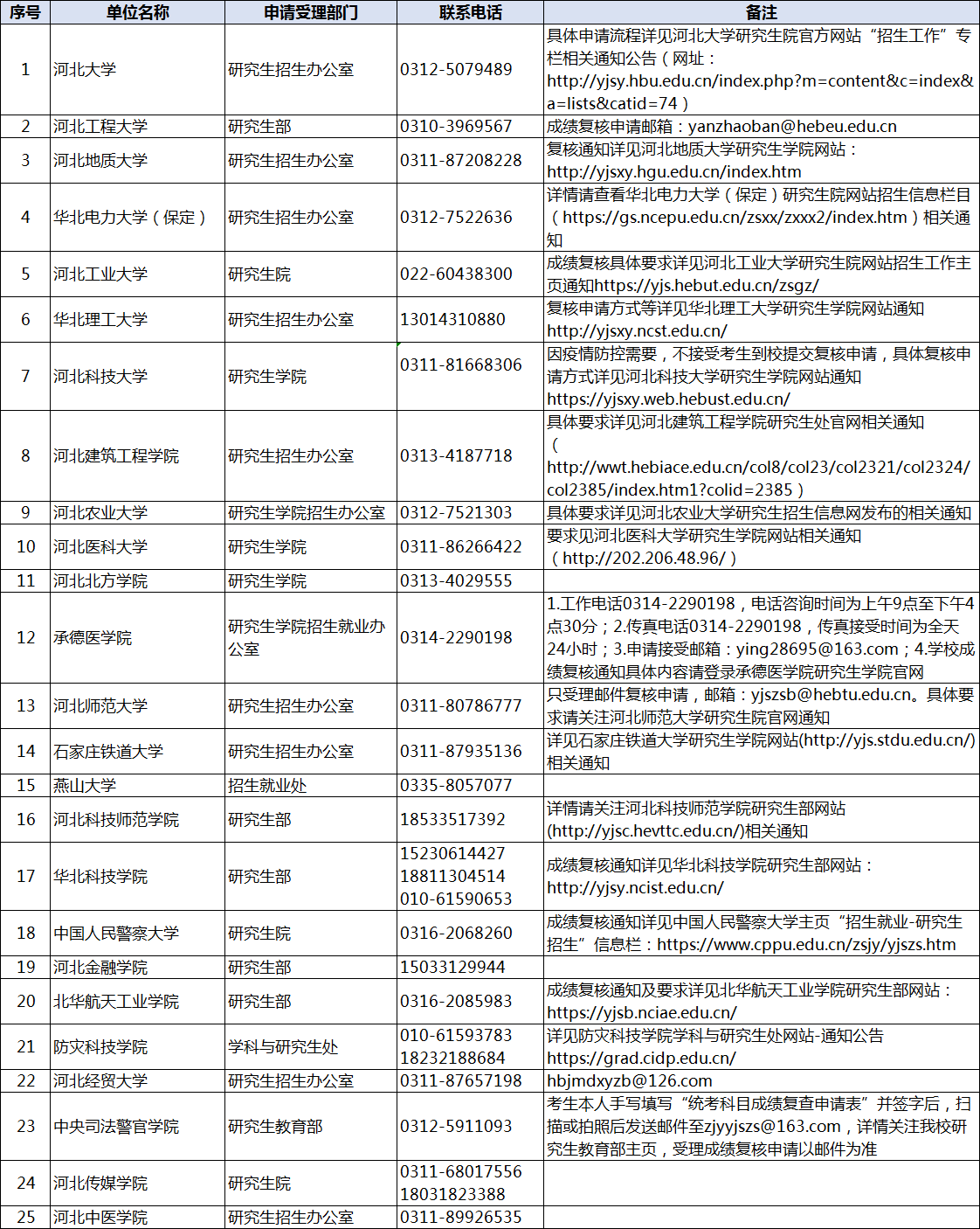 附:河北省2021年全国硕士研究生招生考试各招生单位成绩复核申请工作联系方式