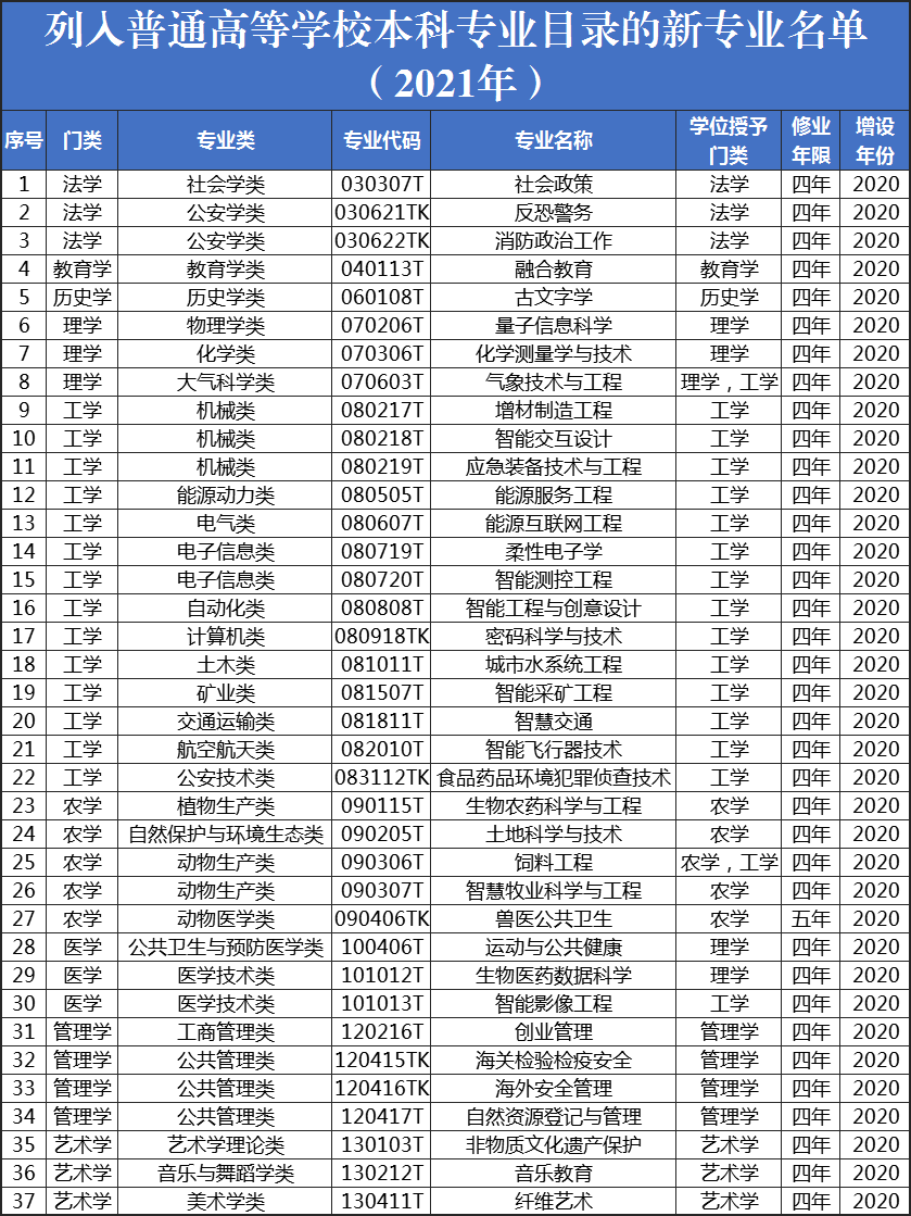 古文字学、量子信息科学、能源互联网工程、智慧交通、智能飞行器技术、创业管理、非物质文化遗产保护等37个新专业列入普通高等学校本科专业目录。
