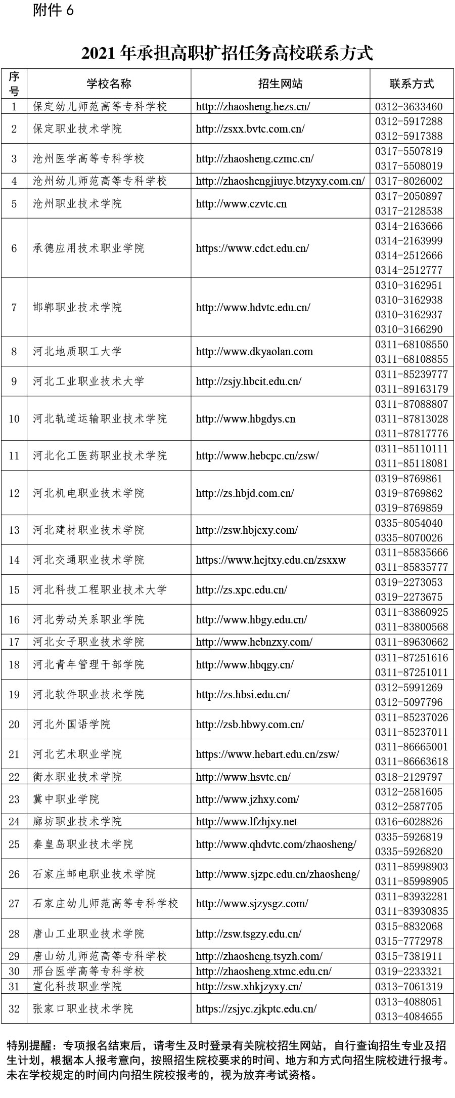 特别提醒:专项报名结束后,考生要及时和有意向报考的院校进行联系,按照院校要求的时间、地方和方式向招生院校进行报考。考生向招生院校报考时需持《2021年河北省高职扩招专项报名考生个人信息表》(9月30日起,考生可登录河北省教育考试院网站(http://www.hebeea.edu.cn),从首页右侧导航栏的“普通高考信息服务”,进入“信息查询”模块进行打印)。