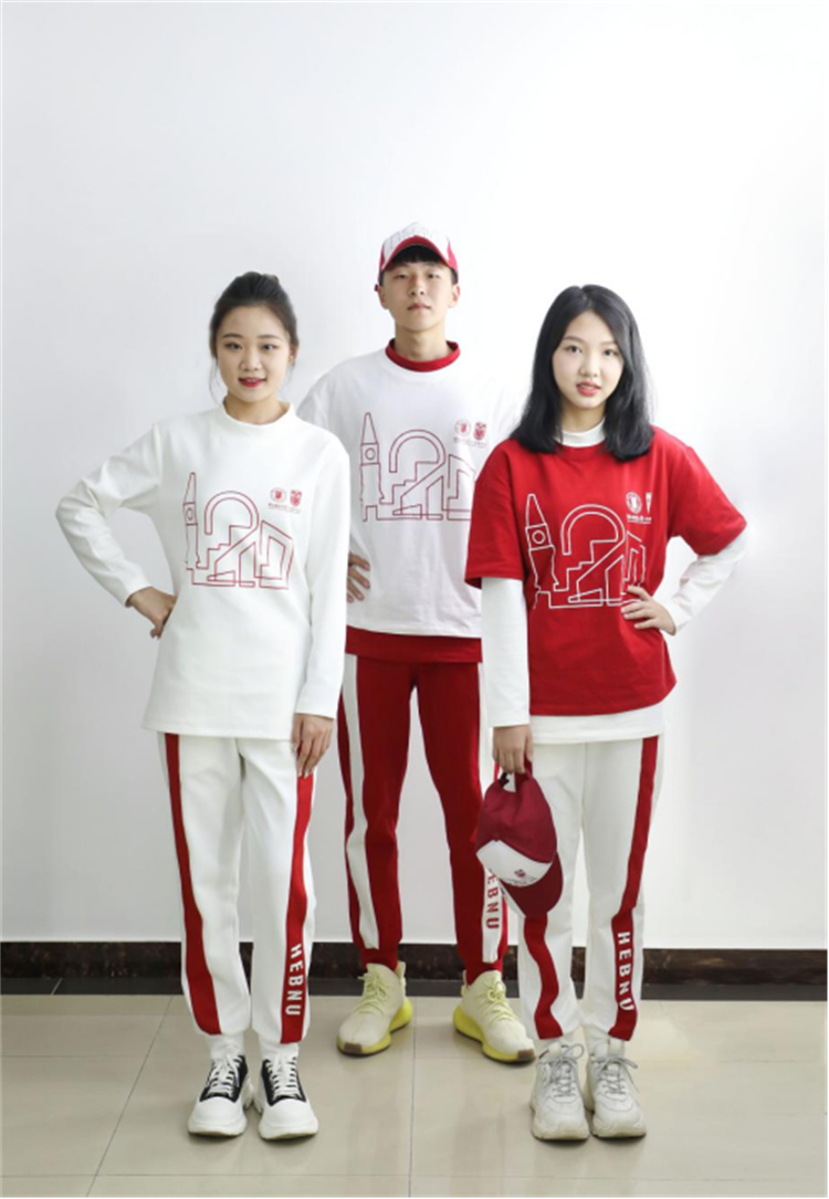 校庆志愿者服装借鉴我国传统“深衣制”中的三层衣搭配方式,吸收北洋女师范学堂(河北师范大学前身)的服饰风格,选取T恤与下装的组合样式。服装以学校标志性建筑物拼成的数字“120”简笔画作为主要图案,颜色以红色、白色为主进行搭配,体现校庆盛典的热烈隆重,象征教育事业的崇高神圣,整体传递出“百廿学府 青春师大”传统与现代兼容并蓄的文化内涵。