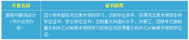 该项目为4+0项目:四年在国内学习,可获得河北美术学院颁发的学位证和毕业证;也可第三、四学年交换到意大利ACME美术学院学习,达到意大利语B1水平,获得中意两国学校学位证;也可选择四年都不出国。四年期间意大利语作为公共必修课,毕业后可达到意大利语B1水平,免试直升意大利大学硕士学位课程。本专业在河北美术学院设计艺术学院就读,师资由两校优秀的师资团队共同组建而成,其中意方负责课程门数、课时、核心课门数各占专业课三分之一及以上。