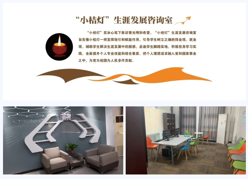 河北交通职业技术学院“小桔灯”生涯发展咨询室成立于2020年,是为全方位提升在校生的职业生涯规划能力、岗位胜任力、就业竞争力,精心打造的院级生涯发展咨询室。“小桔灯”在冰心笔下象征着光明和希望,咨询室致力于引导学生树立起正确的就业观、全面认识专业与职业的关系、以积极心态面对职业选择和生涯发展中的困惑和问题、踊跃参与校内外实习实践活动,以学涯阶段的扎实努力奠定实现职业发展目标的坚实基础,通过夯实技术技能和综合素质提升个人就业竞争力,用一盏盏小桔灯指引学生系好人生第一颗扣子。