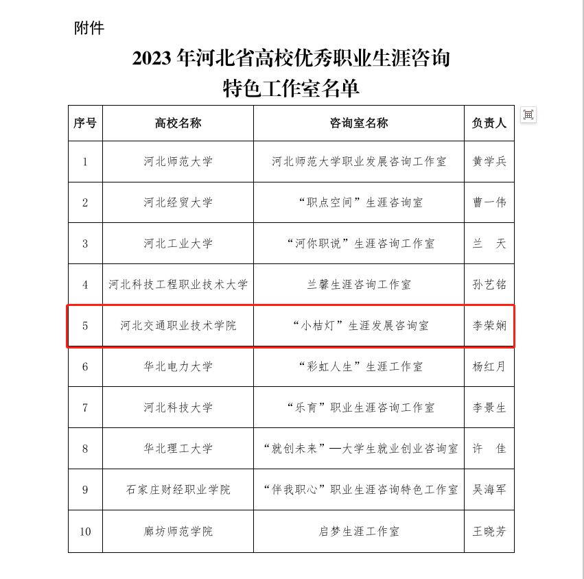 近日,河北省教育厅公布了2023年河北省高校优秀职业生涯咨询特色工作室评选结果,河北交通职业技术学院“小桔灯”生涯发展咨询室成功入选,本次全省共有10所高校的职业生涯咨询特色工作室获评。