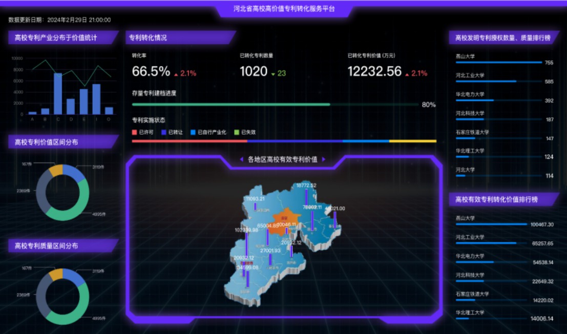 学院高度重视知识产权工作,党委书记、院长张安兵亲自安排部署,组建专项工作小组,在省教育厅、省知识产权局的指导和支持下,积极贯彻落实《专利转化运用专项行动方案(2023-2025年)》和《高校和科研机构存量专利盘活工作方案》,充分发挥高校国家知识产权信息服务中心平台优势,为解决省内各高校盘点工作组织难、填报难的问题,学院开发了“河北省高校高价值专利转化服务平台”,配套上线河北省专利评估系统和高价值专利五链匹配评估系统,提供专利数据可视化展示,为全省高校的专利盘活工作提供技术支撑和信息服务。