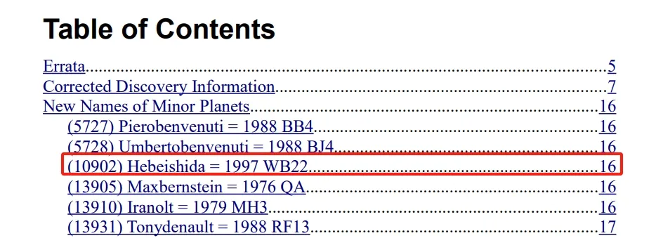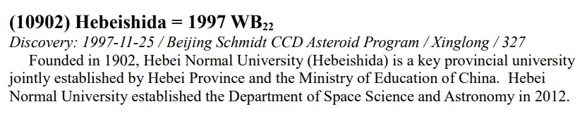 国际永久编号第10902号(=1997 WB22)小行星命名为“河北师大”星,含有两层寓意: