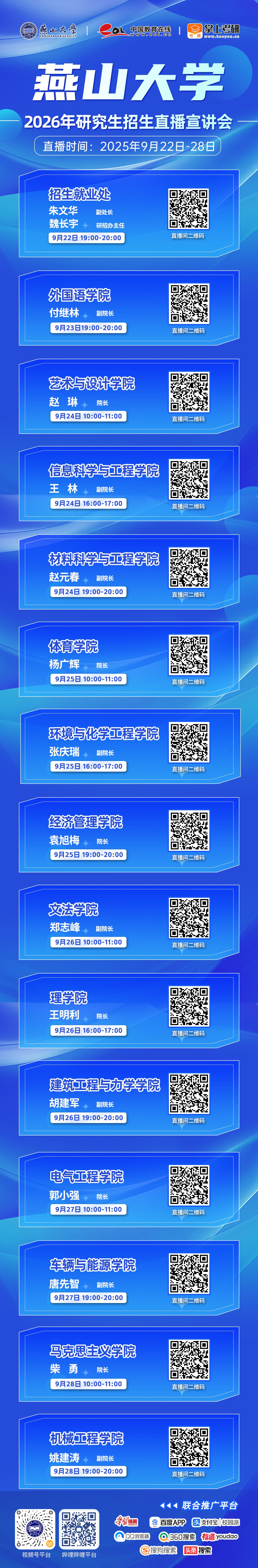 考研逐梦路,研途正启航!为助力广大考生精准把握燕山大学研究生招生政策、深入了解各学科专业优势与培养特色,燕山大学携手金宝搏188入口 、掌上考研,重磅推出2026年研究生招生直播宣讲会。学校招生就业处及各学院院长将齐聚直播间,全方位解读招生政策、专业详情,并在线答疑解惑,为你呈现最权威的研招信息,助你高效规划考研之路,开启学术深造新征程!