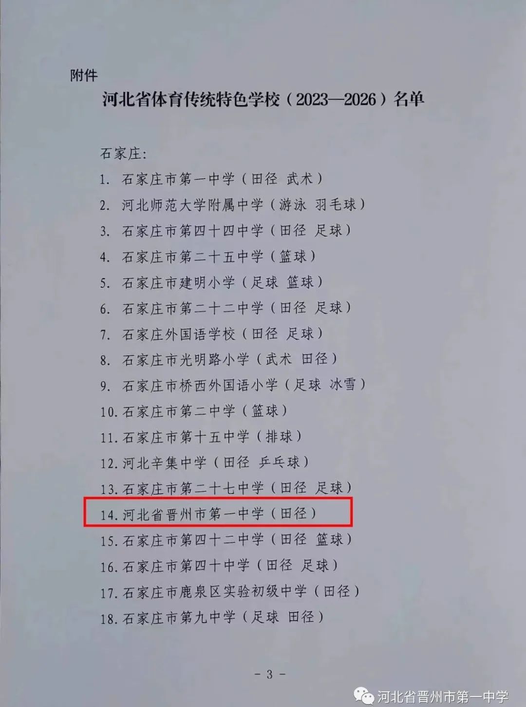近日,河北省体育局、河北省教育厅联合发布了《关于命名河北省体育传统特色学校(2023—2026)公示的通知》。晋州市第一中学荣获新一周期河北省体育传统特色学校(田径)。