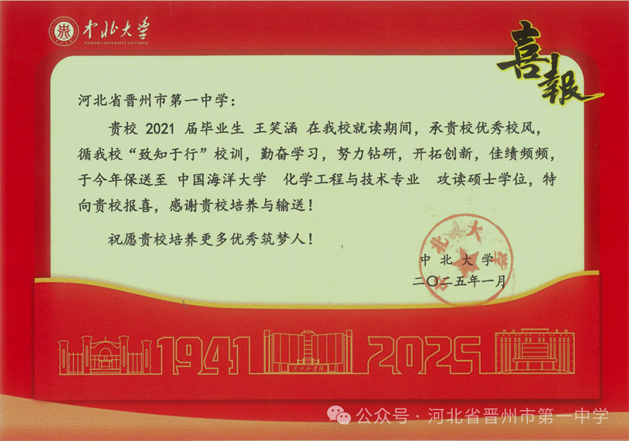 近日,中北大学向我校发来喜报,祝贺我校2021届优秀毕业生王笑涵在该校就读期间表现优异,于今年被保送至中国海洋大学化学工程与技术专业攻读硕士学位。这份喜报,不仅是对我校育人成果的肯定,更是对未来两校深度合作的热切召唤。