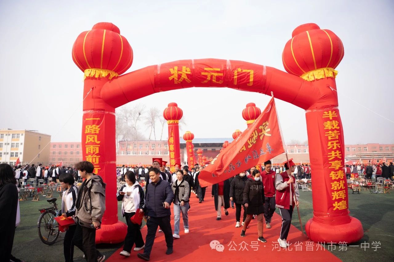 鲤鱼跃龙门,一朝化作龙。全体高三学生在家长的陪同下走进成人门,走过红毯,在与全体高三教师的击掌和祝福声中走出状元门。