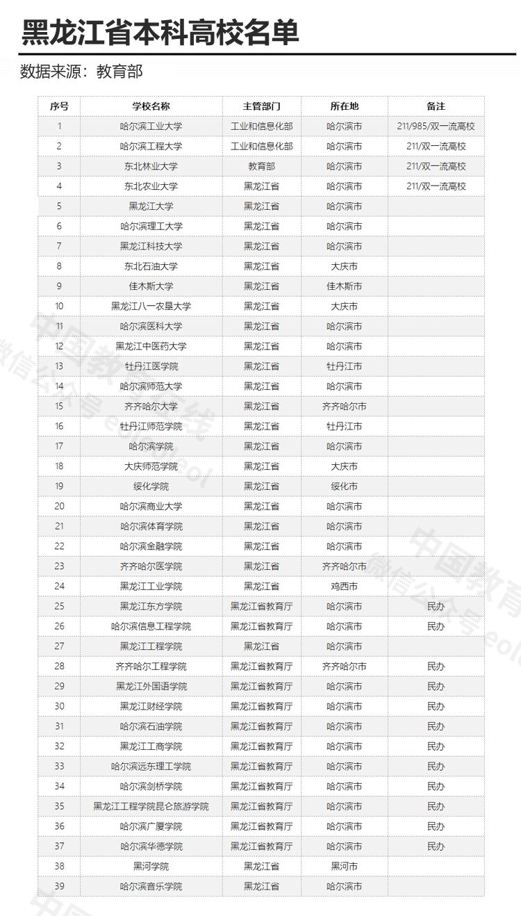 根据金博宝最新官方网站查询网址 公布的名单显示,截至2019年6月,黑龙江省共有普通高等学校81所。其中本科院校39所(公办27所,民办12所)。专科42(公办36所,民办6所)。详细名单请见文末。
