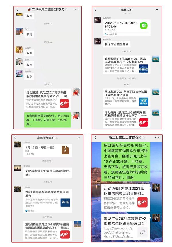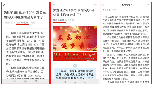 在疫情常态化防控下,黑龙江高职单招报考临近,网络直播活动成为高校招生宣传的主要渠道。因此,本次公益直播活动受到教育主管部门的高度重视,黑龙江省教育厅、佳木斯市教育局、桦川县教育局、五常市教育局、五大连池市教育局、黑河教育局、北安教育局、呼兰区教育局、黑龙江教育杂志社等有关部门给与大力支持!另外,本次公益活动也得到了黑龙江省百余所高中的支持响应。