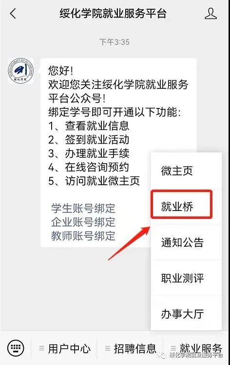 “绥化学院就业服务平台”微信公众号和绥化学院就业信息网增设“就业桥”链接。“就业桥”是政府就业工作的助手、高校就业服务的抓手、用人单位及毕业生的供需桥梁。