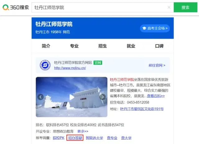 2、使用360浏览器,检索“牡丹江师范学院”点击“招办答疑”即可进入咨询。
