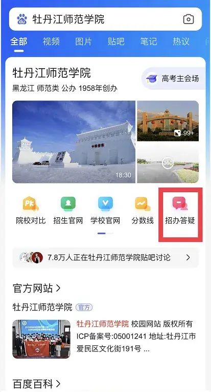 6、使用手机百度app检索“牡丹江师范学院”点击“招办答疑”即可进入咨询。
