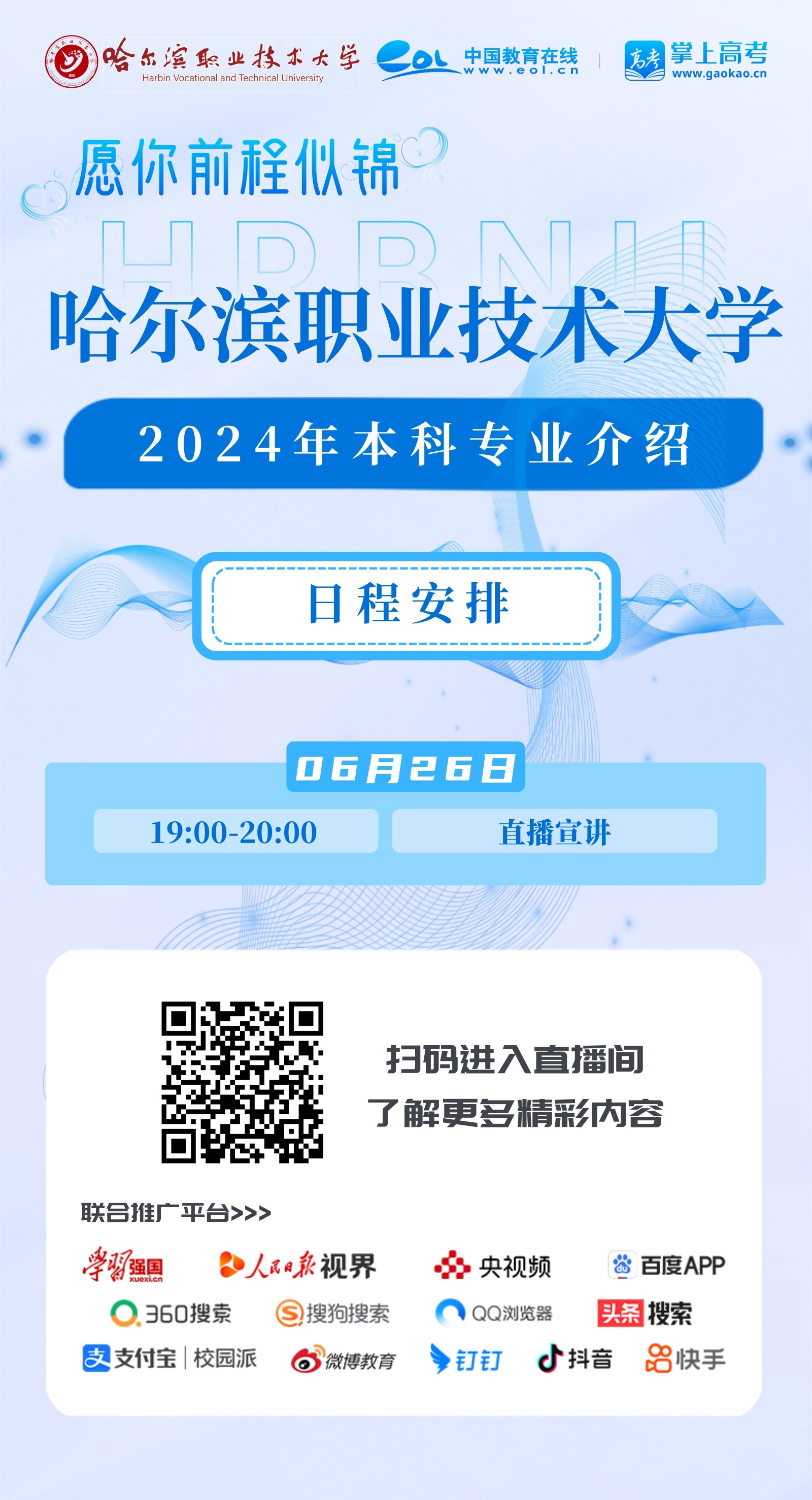 报考季,为满足同学们的需求,建立高校与同学们间的多方位信息沟通平台。6月26日晚7点,哈尔滨职业技术大学将会在官方平台开设直播间,为2024届考生家长云端解读报考政策,欢迎报考哈尔滨职业技术大学。