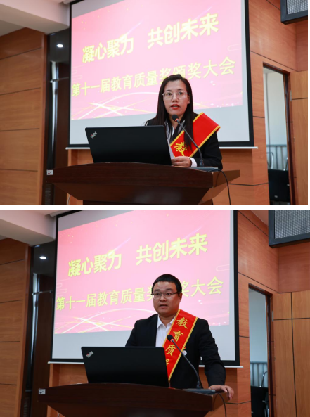 建筑管理工程系张晶晶、机电工程系于海龙代表全体获奖教师作了发言。两位教师分别表达了获奖教师对学校给予奖励的感谢。并从个人成长、教学感悟以及育人感受等方面,分享了身为教师的荣誉感和使命感,他们表示,将坚定不移地秉持“以学生为中心”的教育理念,积极传承和弘扬学校倡导的“亮剑”精神,认真履行教师的神圣职责,将教育家精神作为持续奋斗的强大动力,为学校高质量发展而努力奋斗。