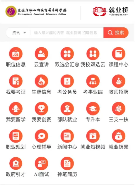 同学们只需要关注“黑龙江幼儿师范高等专科学校”公众号,在“服务指南”功能中选择“就业桥”就可快速获得以上信息。