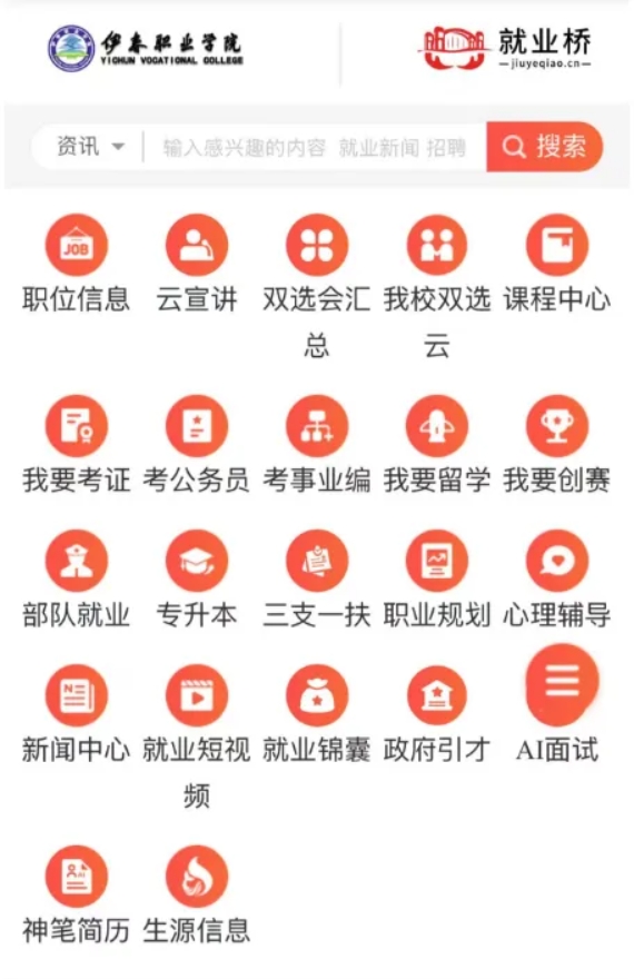 伊春职业学院为更好的服务学校广大实习、就业学生,推动毕业生高质量就业服务,精准搭建金宝搏188入口 ·就业桥一站式服务平台。依托金宝搏188入口 ·就业桥,为学生提供一站式就业指导服务.就业桥涵盖“职位信息””神笔简历””AI面试”“学校双选云”“我要考证”“考公务员”“考事业编”“专升本”“我要留学”“我要创赛”“部队就业” “职业规划”“心理辅导”“新闻中心”等二十三大内容模块,全方面覆盖生涯发展板块,为广大学生的毕业去向保驾护航。