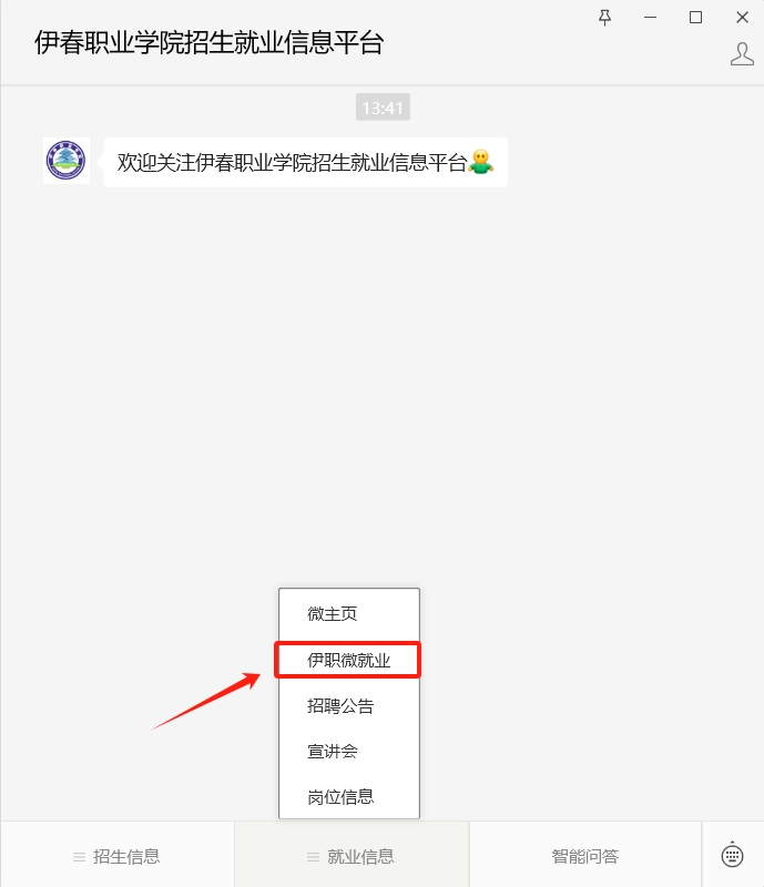 同学们只需要关注“伊春职业学院招生就业信息平台”公众号,在“就业信息”功能中选择“伊职微就业”就可快速获得以上信息。