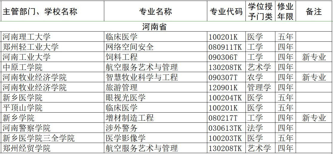 其中,河南省各高校新增备案本科专业93个、新增审批专业12个、调整学位授予门类或修业年限专业5个、撤销专业31个。具体名单如下: