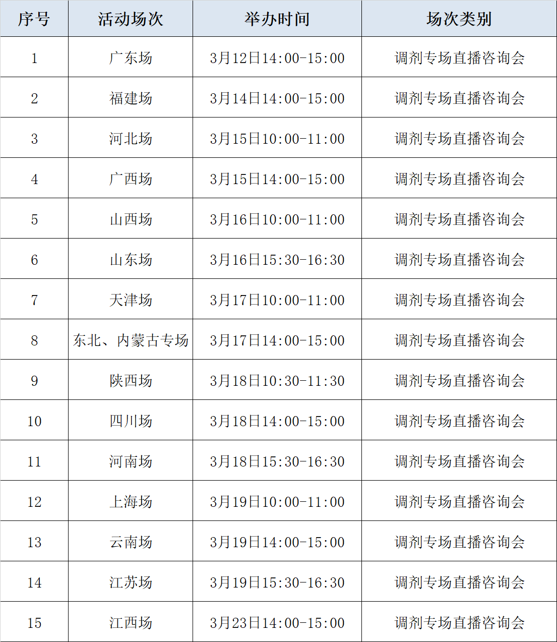 本次2021年全国研究生网络调剂直播咨询会分为学校专场和省份专场,省份专场观看场次安排如下: