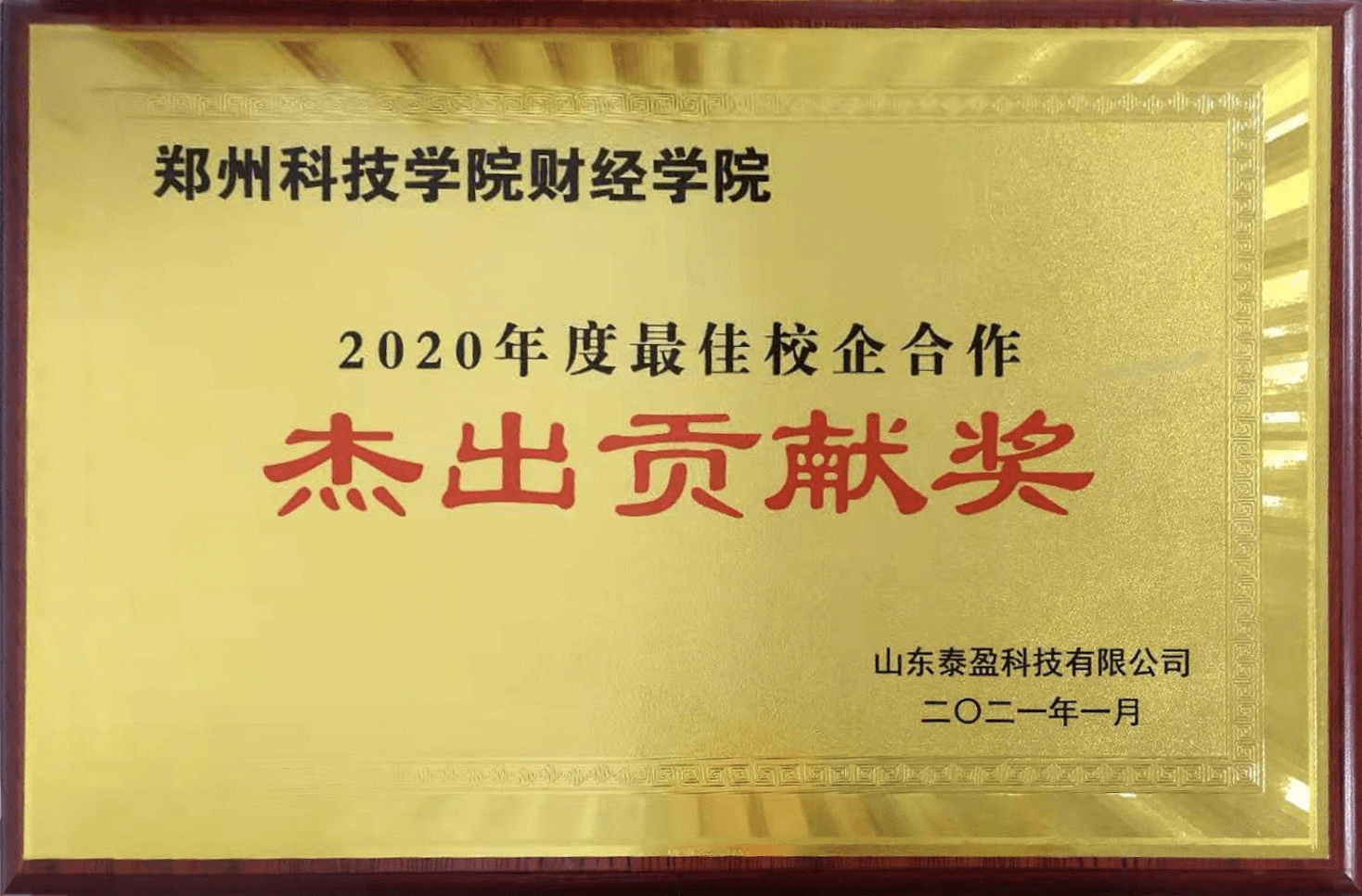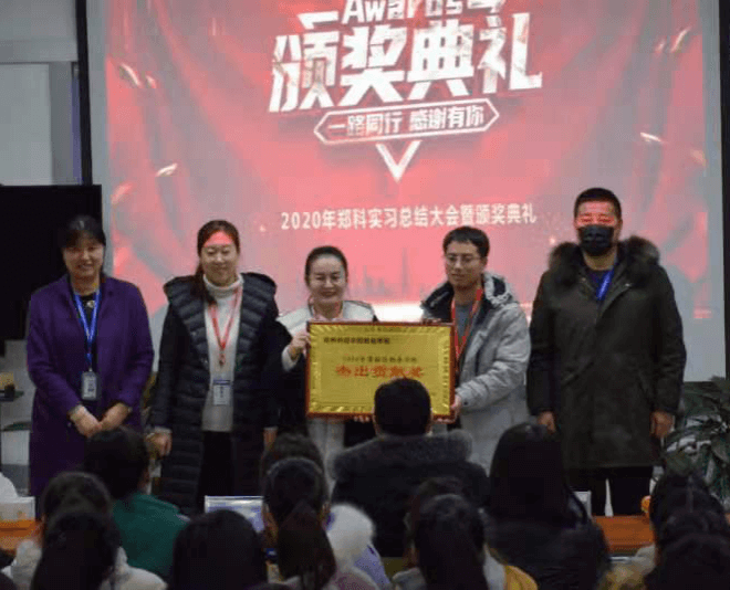陈志建、杨青代表企业授予郑州科技学院财经学院“2020年度最佳校企合作杰出贡献奖”。这表明本年度学生实习实训工作取得丰硕成果,也为进一步深化“校企合作、协同育人”奠定了良好基础。