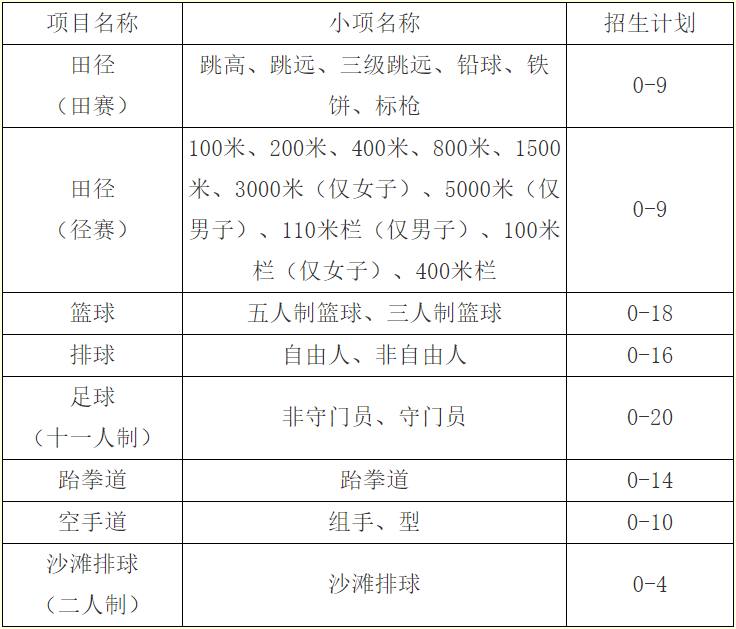 (1)田径(可报考项目:100米、200米、400米、800米、1500米、3000米女、5000米男、110米栏男、100米栏女、400米栏、跳高、跳远、三级跳远、铅球、铁饼、标枪);(2)篮球;(3)排球(含自由人);(4)足球(十一人制,含守门员);(5)跆拳道;(6)空手道;(7)沙滩排球(二人制)。