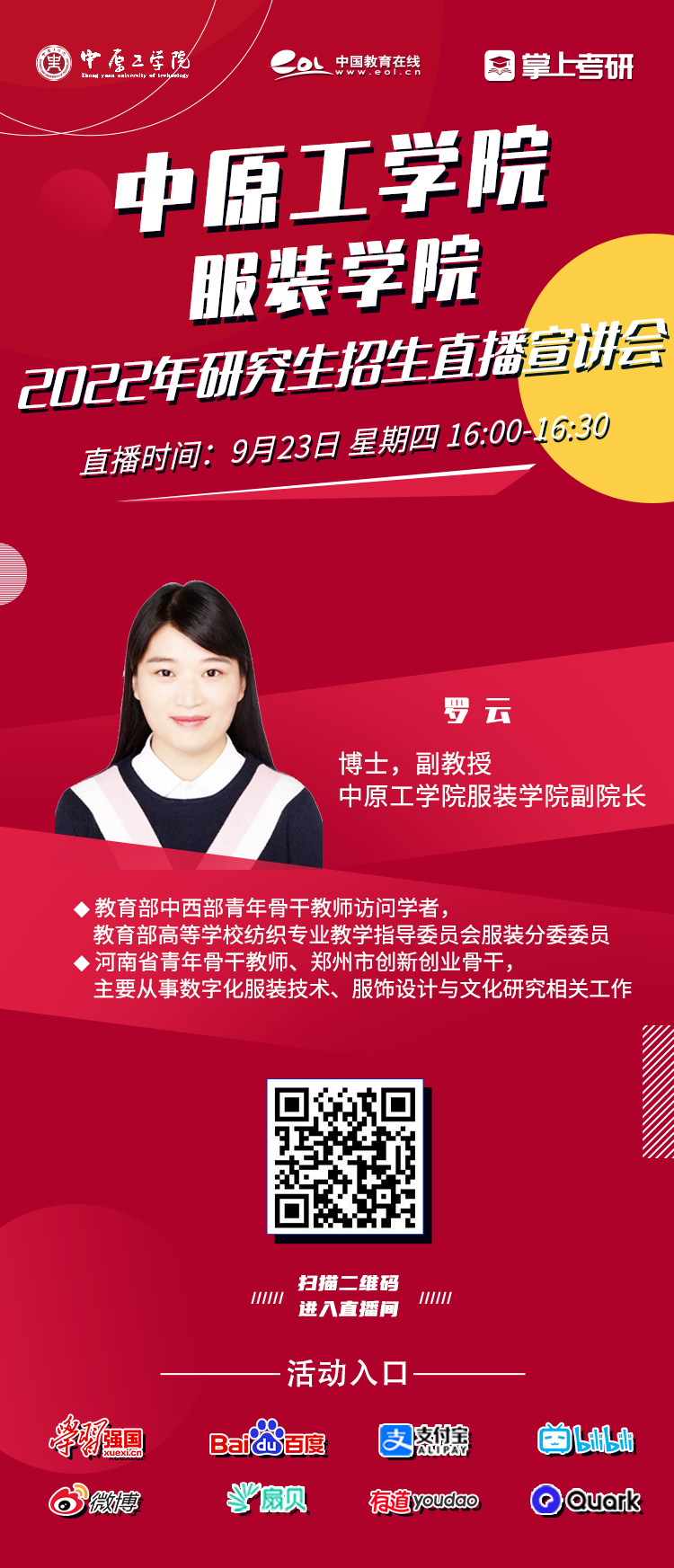 为满足考生对研招政策咨询需求,建立招生单位与考生之间高效的信息沟通渠道,金宝搏188入口 ·掌上考研联合中原工学院举办的服装学院2022年研究生招生直播咨询会即将开启!
