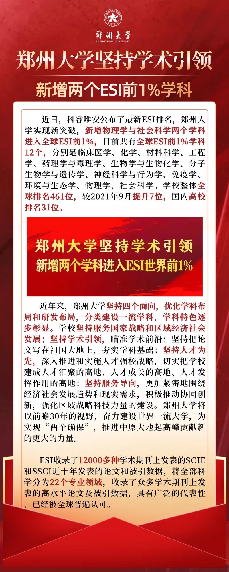 新增两个!郑州大学十二个学科进入ESI世界前1%!