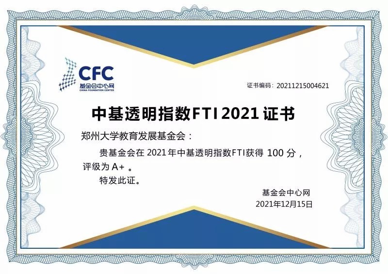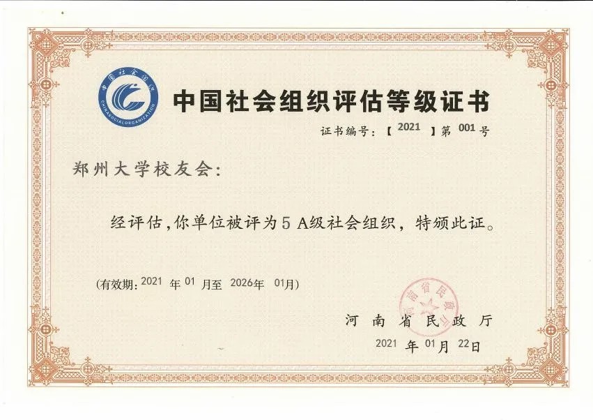 2021年1月,郑州大学校友会在中国社会组织评估中获评最高等级5A级,成为全国42所一流大学中唯一一家5A级校友会。此前,郑州大学教育发展基金会曾在2019年获评中国5A级社会组织,并获基金会中心网所颁发的自律透明奖。至此,郑州大学成为全国42所一流大学中唯一一家同时获评5A级校友会、5A级基金会的“双5A”高校。2021年12月,郑州大学教育发展基金会在基金会中心网发布的中基透明指数FTI2021榜单中再次获得满分(100分),评级为A+,并列全国第一,创造了连续四年蝉联FTI满分的佳绩。
